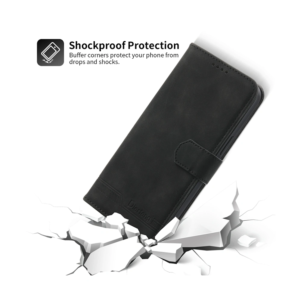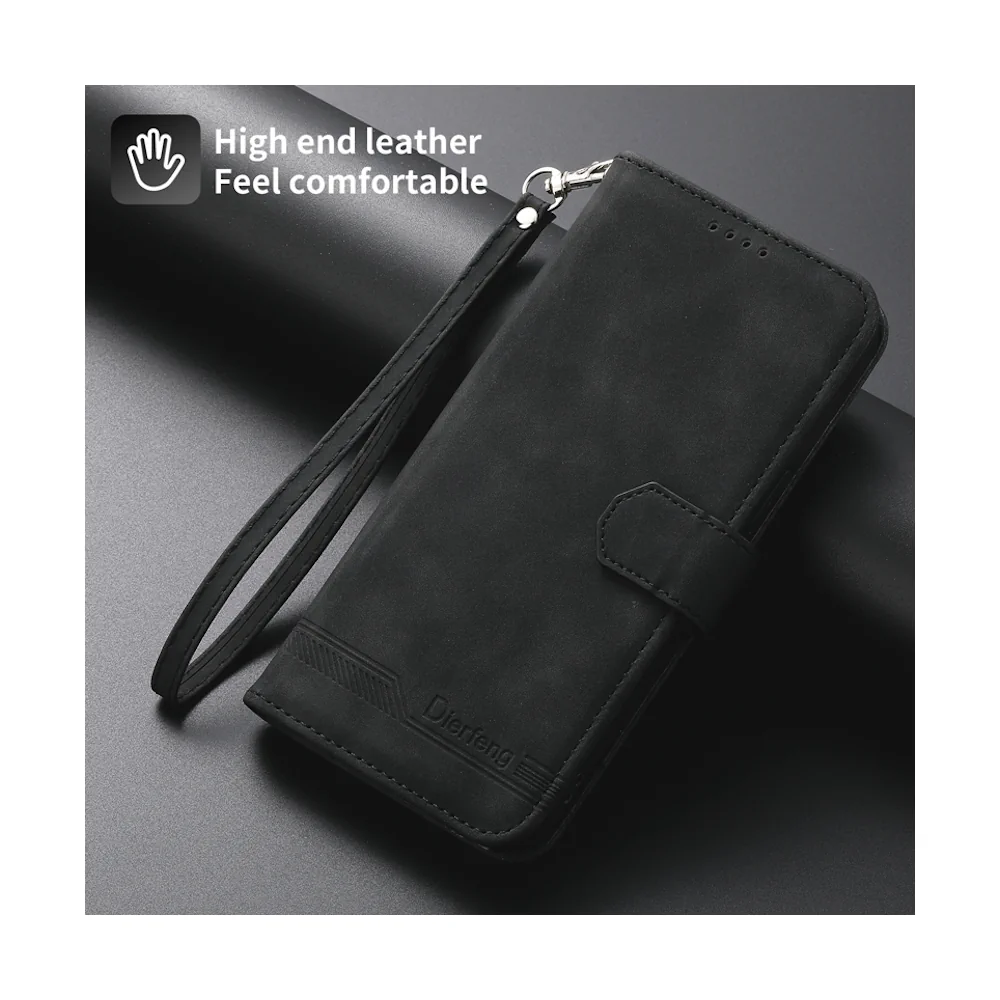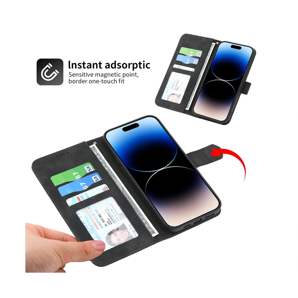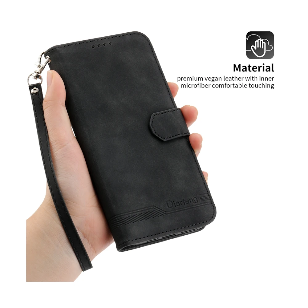 Роскошный чёрный чехол-книжка из веган-кожи — это стиль и надёжная защита в одном аксессуаре. Оснащён отделениями для карт и прочной магнитной застёжкой, надежно защищает от падений.