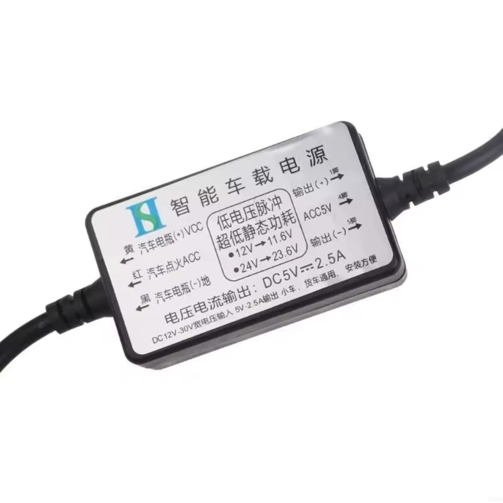 Устройство подключается напрямую к бортовой сети автомобиля (от 12 В до 30 В) и автоматически понижает напряжение до стабильных 5 В, обеспечивая безопасную и постоянную работу регистратора даже при выключенном двигателе.