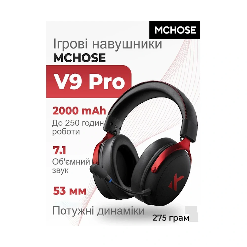 Беспроводные игровые наушники с микрофоном MCHOSE V9 Pro Black-Red (7.1 Surround, 2000 мА·ч), Чёрные с красными вставками.