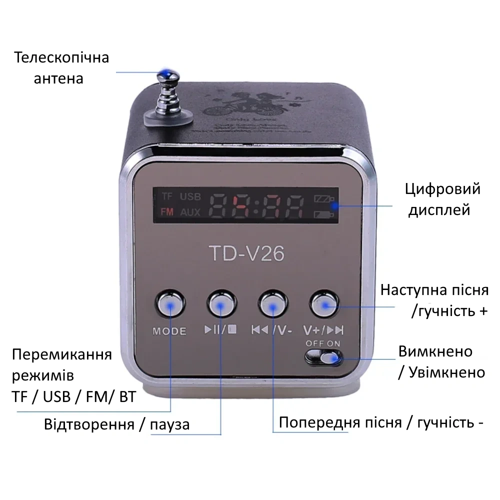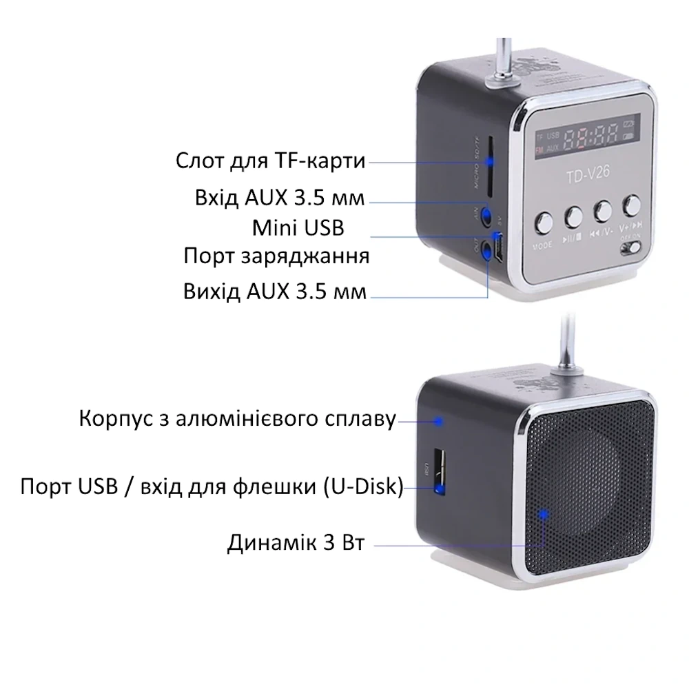Мини-радио-колонка TD-V26 — это компактное и мощное устройство, объединяющее функции FM-радио, MP3-плеера и внешнего динамика. Она поддерживает воспроизведение музыки с USB-флешек, microSD/TF-карт и AUX-входа, имеет телескопическую антенну и встроенный аккумулятор. Корпус выполнен из прочного алюминиевого сплава, что делает устройство долговечным и устойчивым к повреждениям. Благодаря цифровому дисплею и удобным кнопкам управления, использование максимально простое.
