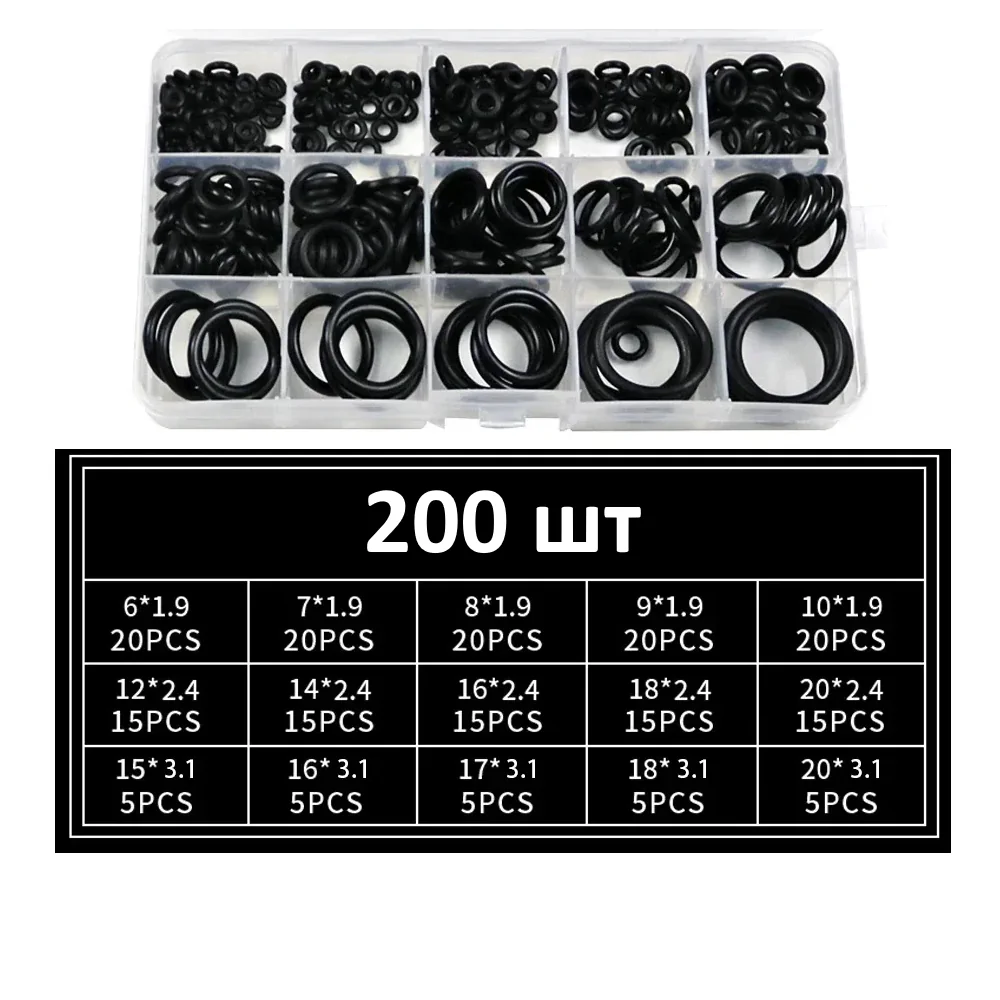 Набор из 200 резиновых уплотнительных колец (O-Ring) из нитриловой резины (NBR) для герметизации соединений. Подходят для сантехники, автомобилей, насосов и бытовых приборов.