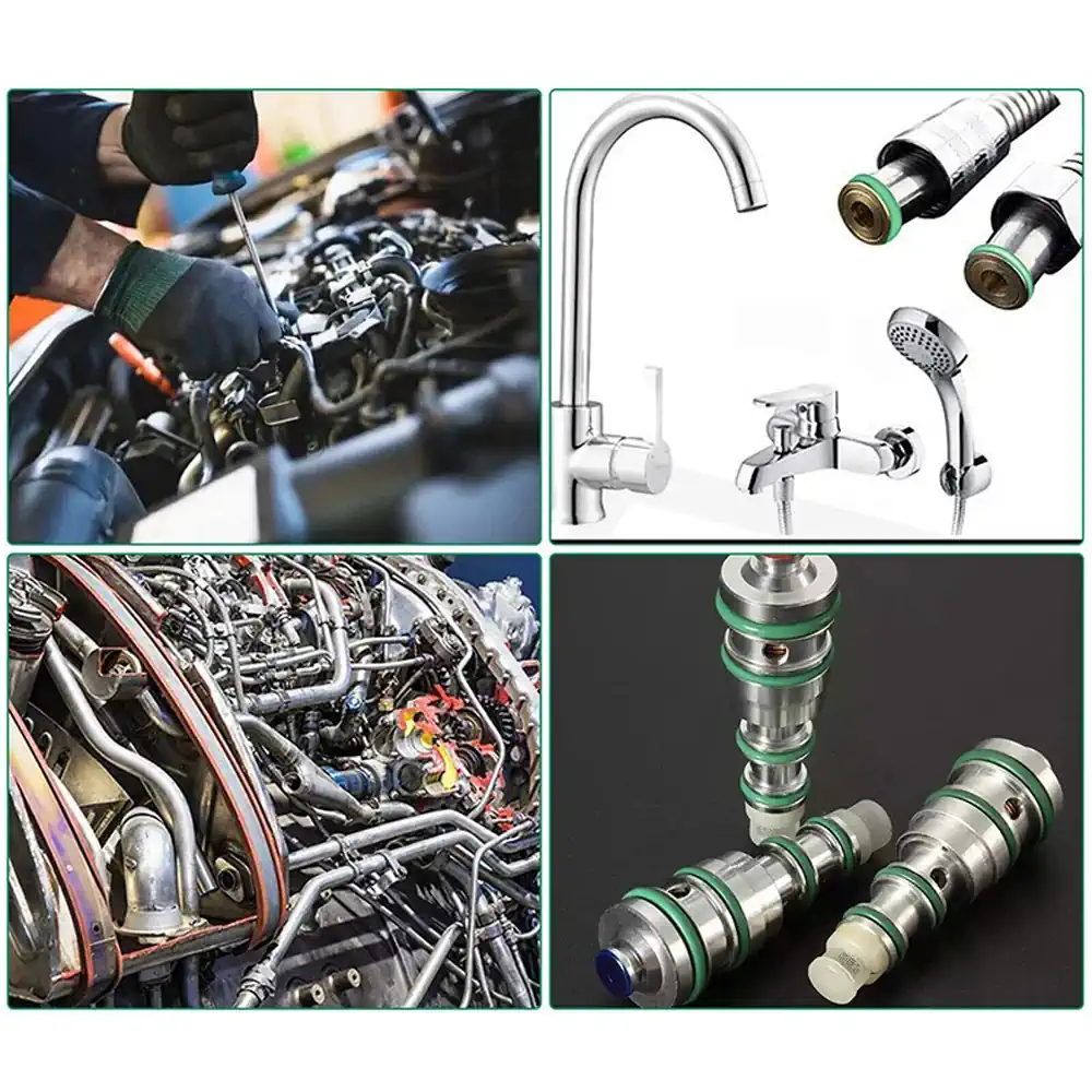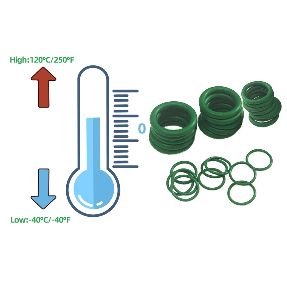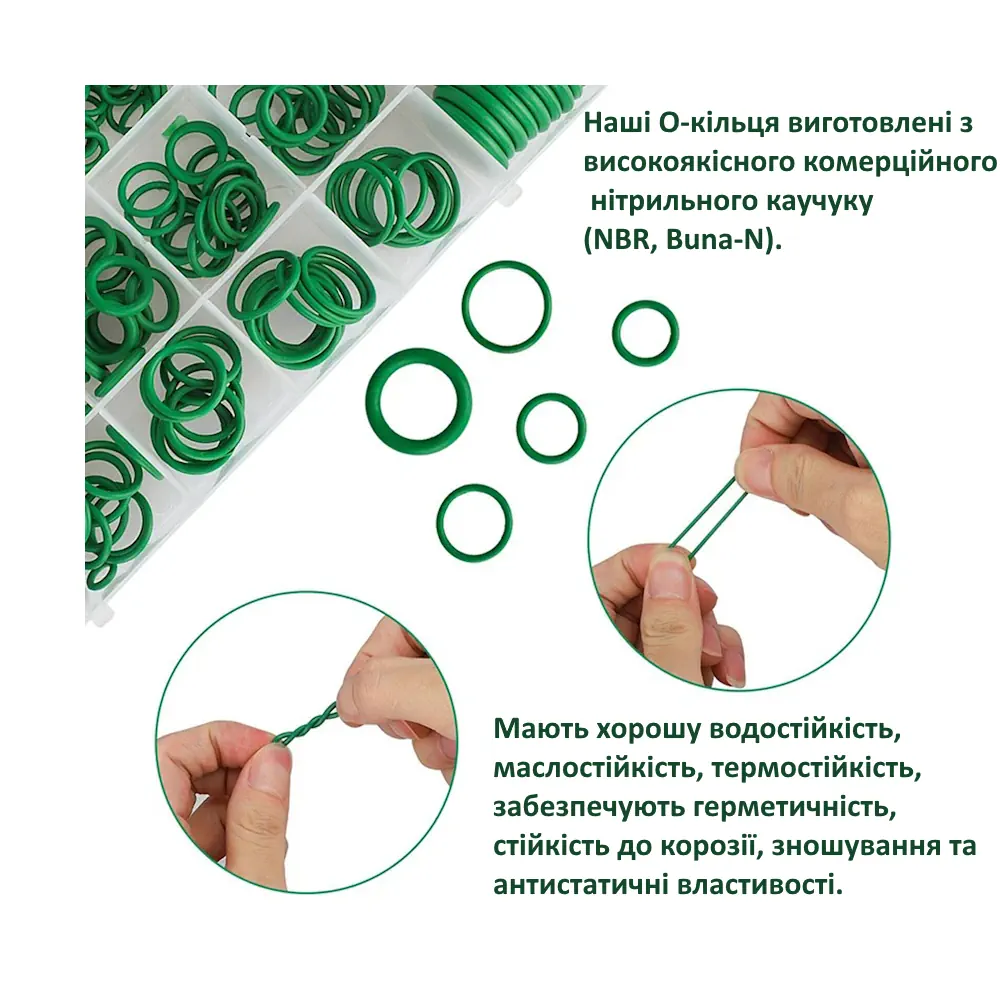 Набор зелёных уплотнительных колец (O-Ring) предназначен для ремонта и обслуживания различных систем: автомобильных кондиционеров (R134a), насосов, сантехнических соединений, бытовой техники и промышленного оборудования. Кольца изготовлены из качественного нитрильного каучука (NBR), обладают высокой эластичностью, устойчивостью к маслам, износу, перепадам температур и воздействию ультрафиолета. Благодаря широкому выбору размеров комплект подходит для универсального применения в автомастерских, сервисных центрах, а также в быту.