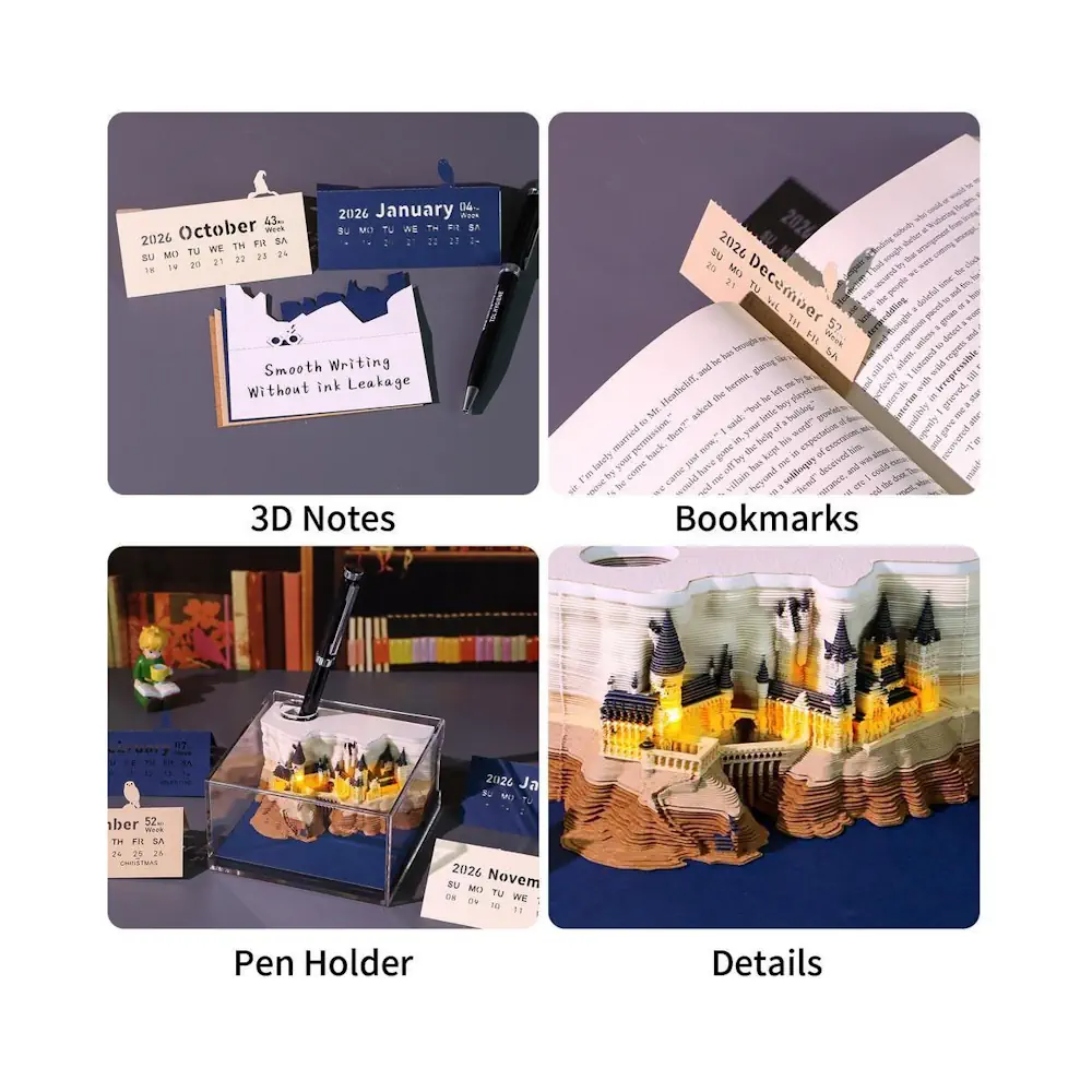 Отрывной 3D-календарь Замок на 2026 год с LED-подсветкой — Хотите удивить близких или подчеркнуть свой утончённый вкус? Обратите внимание на трёхмерный календарь-блокнот «Волшебный Замок» 2026 года. Он сочетает элегантный дизайн с удобным планированием по неделям и станет эффектным акцентом в вашем рабочем или домашнем интерьере.