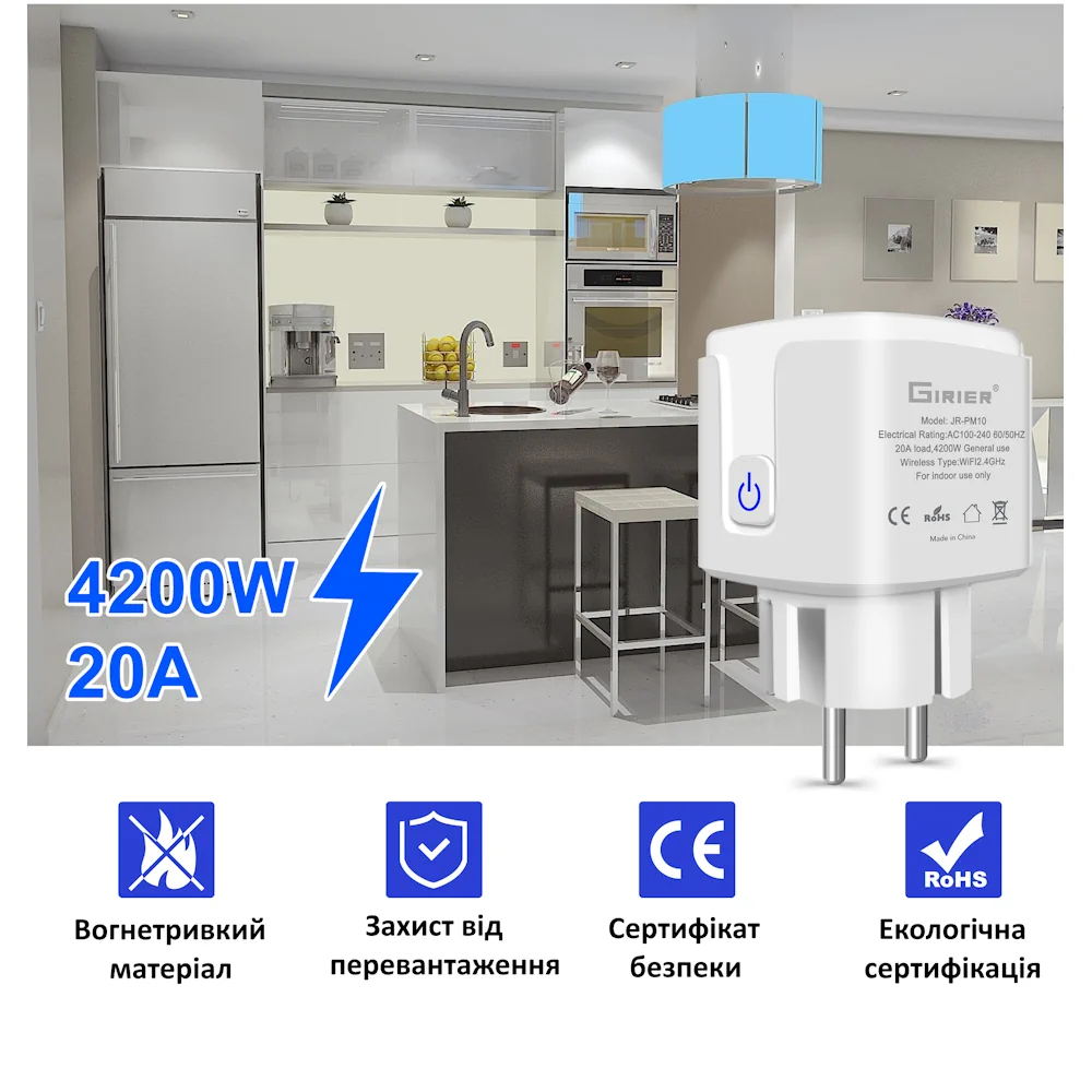 Умная Wi-Fi розетка GIRIER 20A позволяет дистанционно управлять электроприборами, контролировать энергопотребление и настраивать таймеры через приложение Tuya Smart или Smart Life. Поддерживает голосовое управление через Google Home и Amazon Alexa.