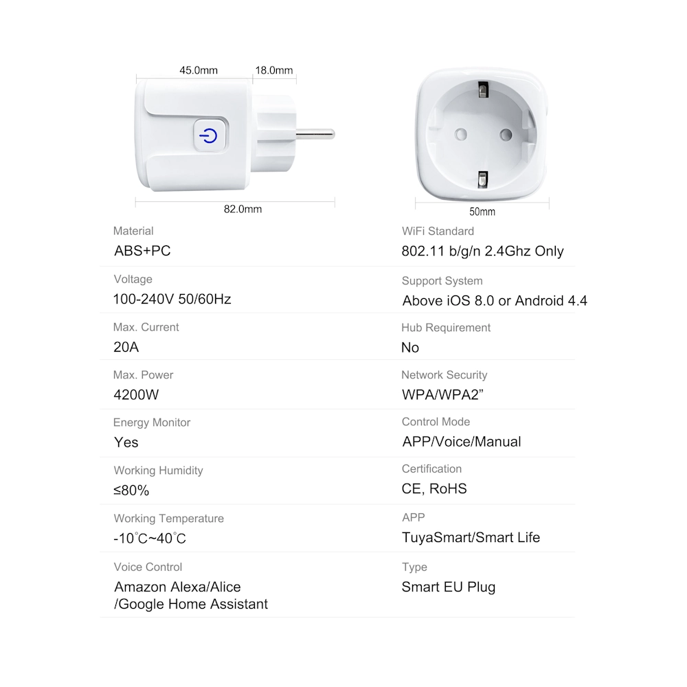 Розетка поддерживает мониторинг энергопотребления, голосовое управление через Google Assistant и Amazon Alexa, а также позволяет настраивать таймеры, сценарии и автоматическое включение/выключение устройств.