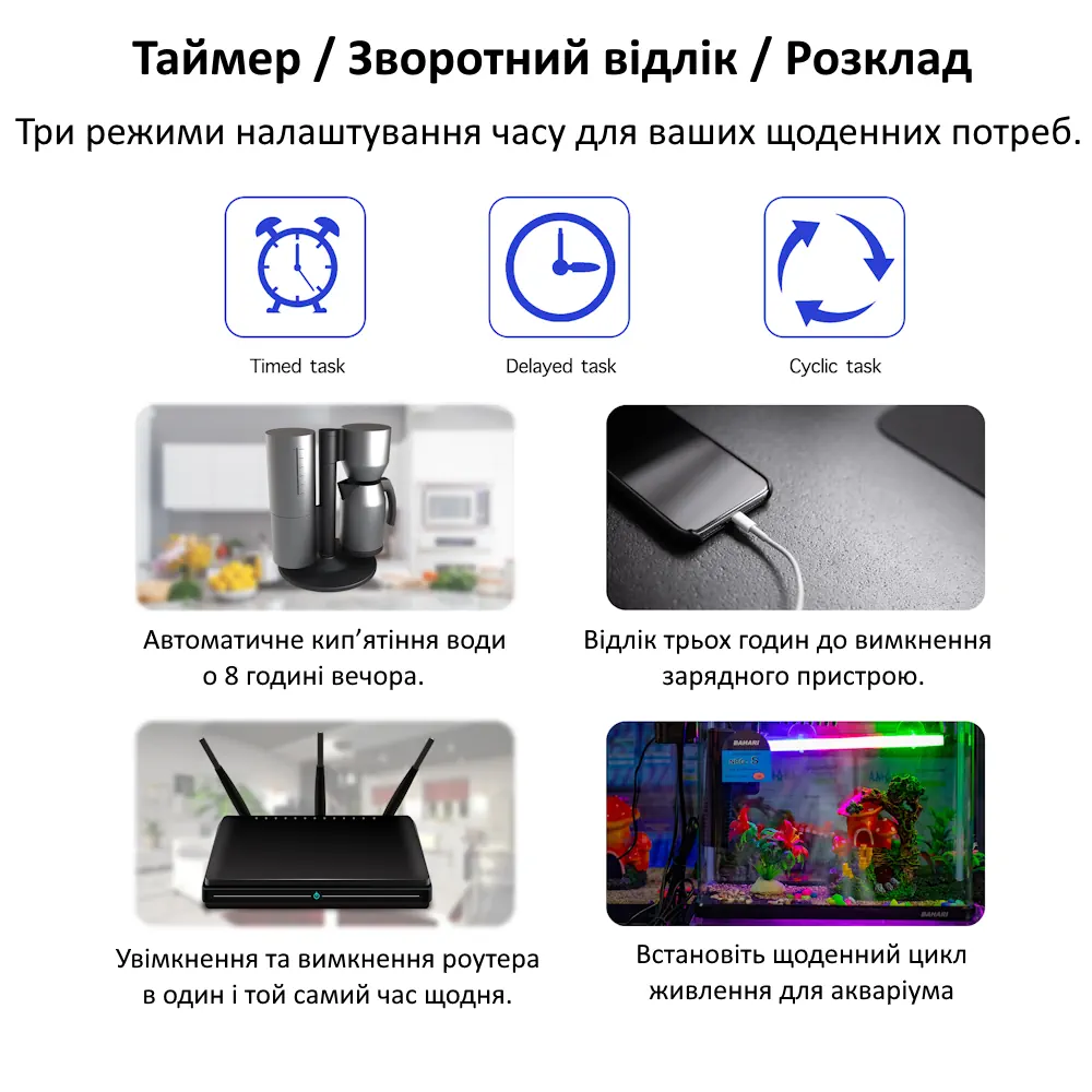 • Таймер и обратный отсчёт — автоматическое включение и выключение.