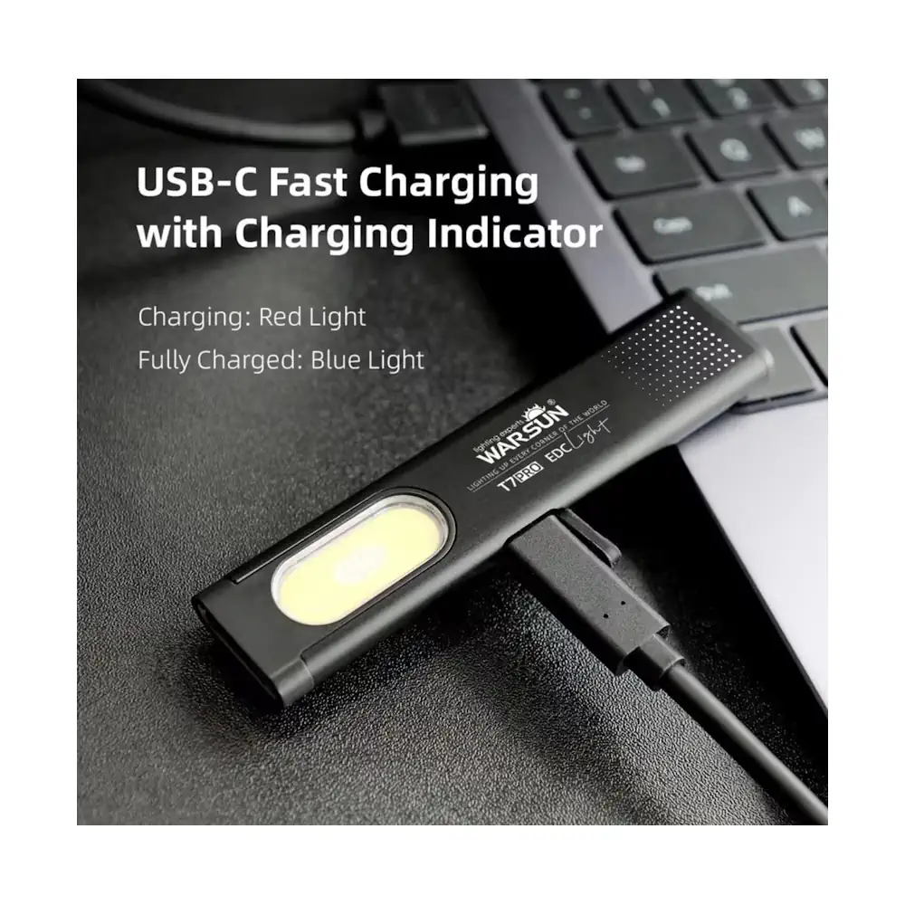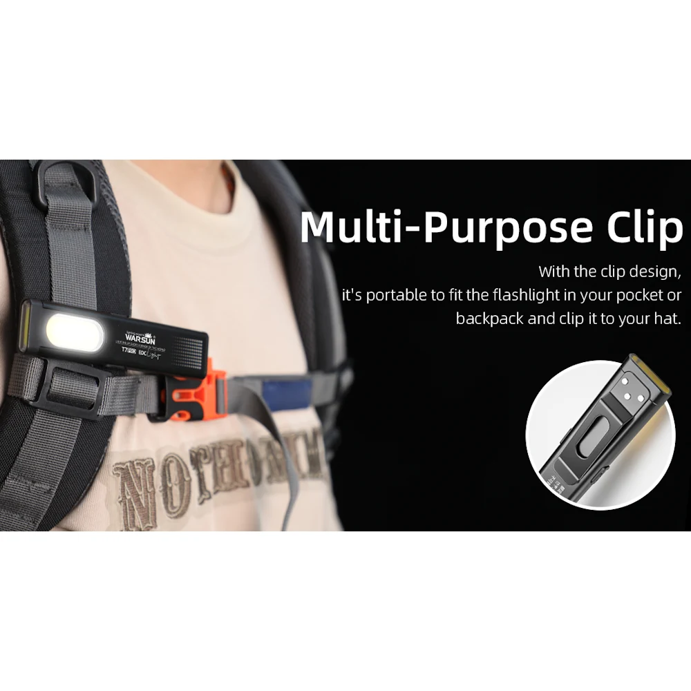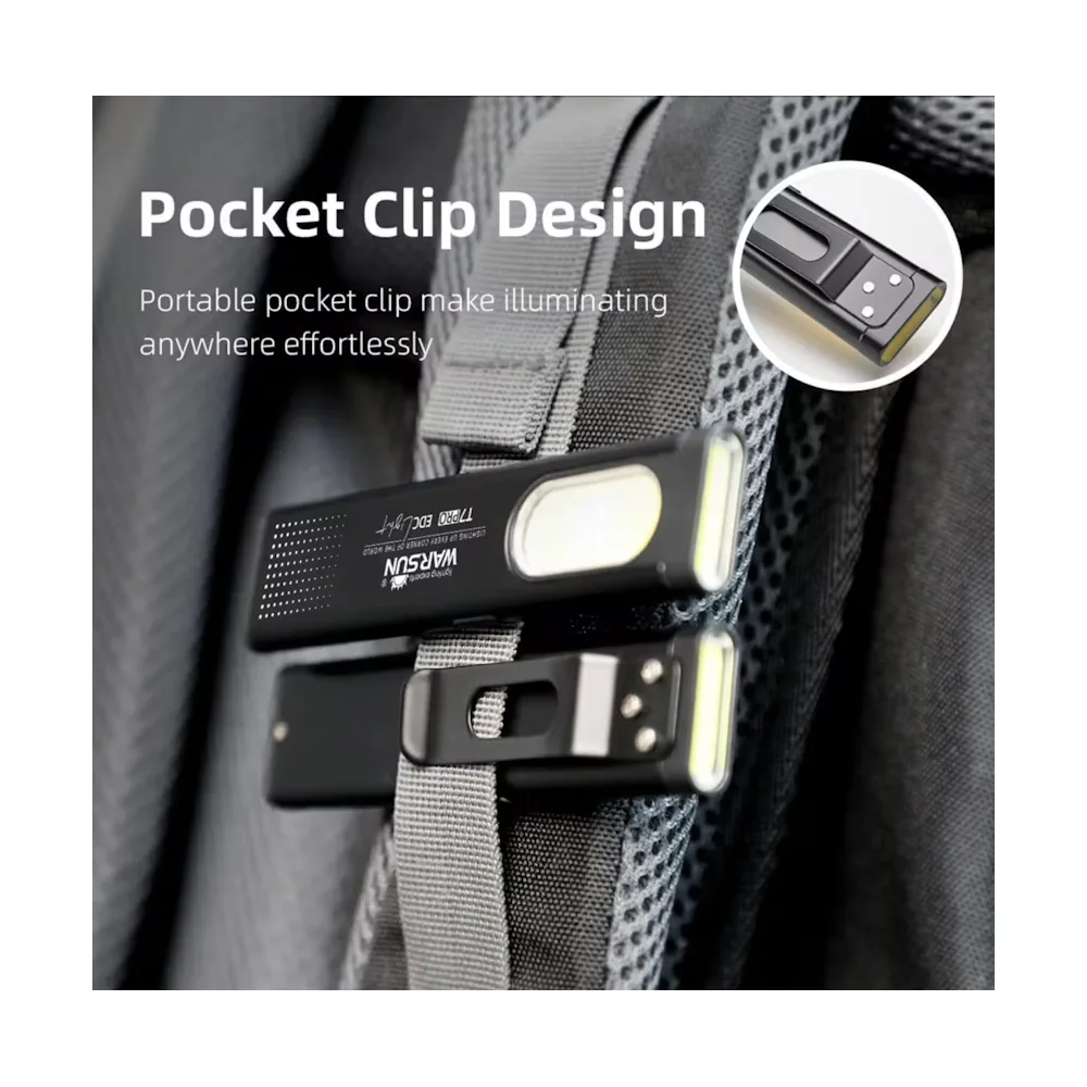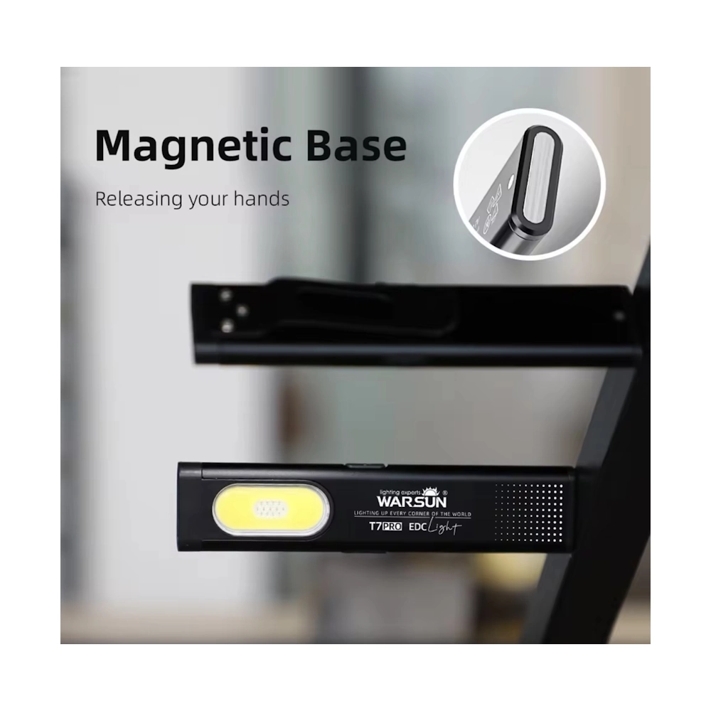 Warsun T7 Pro (комплект 2 шт) — компактный плоский LED-фонарик с магнитным основанием и клипсой. Крепится клипсой на карман, ремень, лямку рюкзака или козырёк кепки, а магнитное основание позволяет быстро зафиксировать его на металлической поверхности и освободить руки. Имеет 2 источника света — торцевой «основной» и боковую COB-панель, поэтому подходит и для подсветки вдаль, и для ближних задач (ремонт, авто, подъезд, кемпинг, аварийные ситуации). Заряжается от USB-C, есть индикатор зарядки.