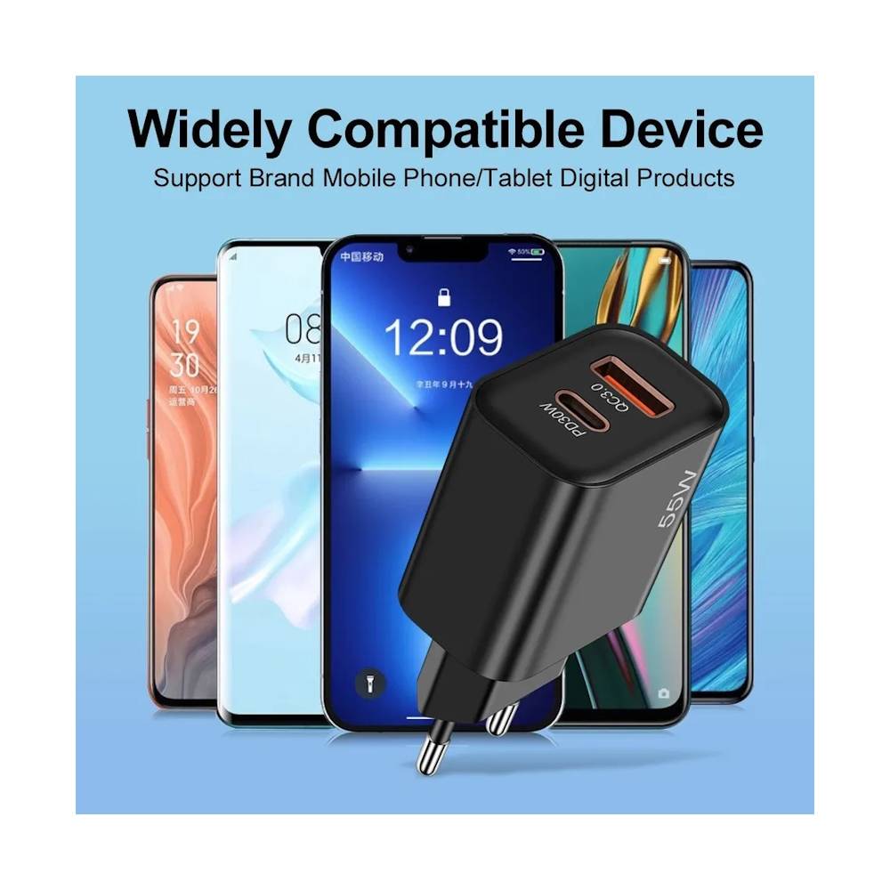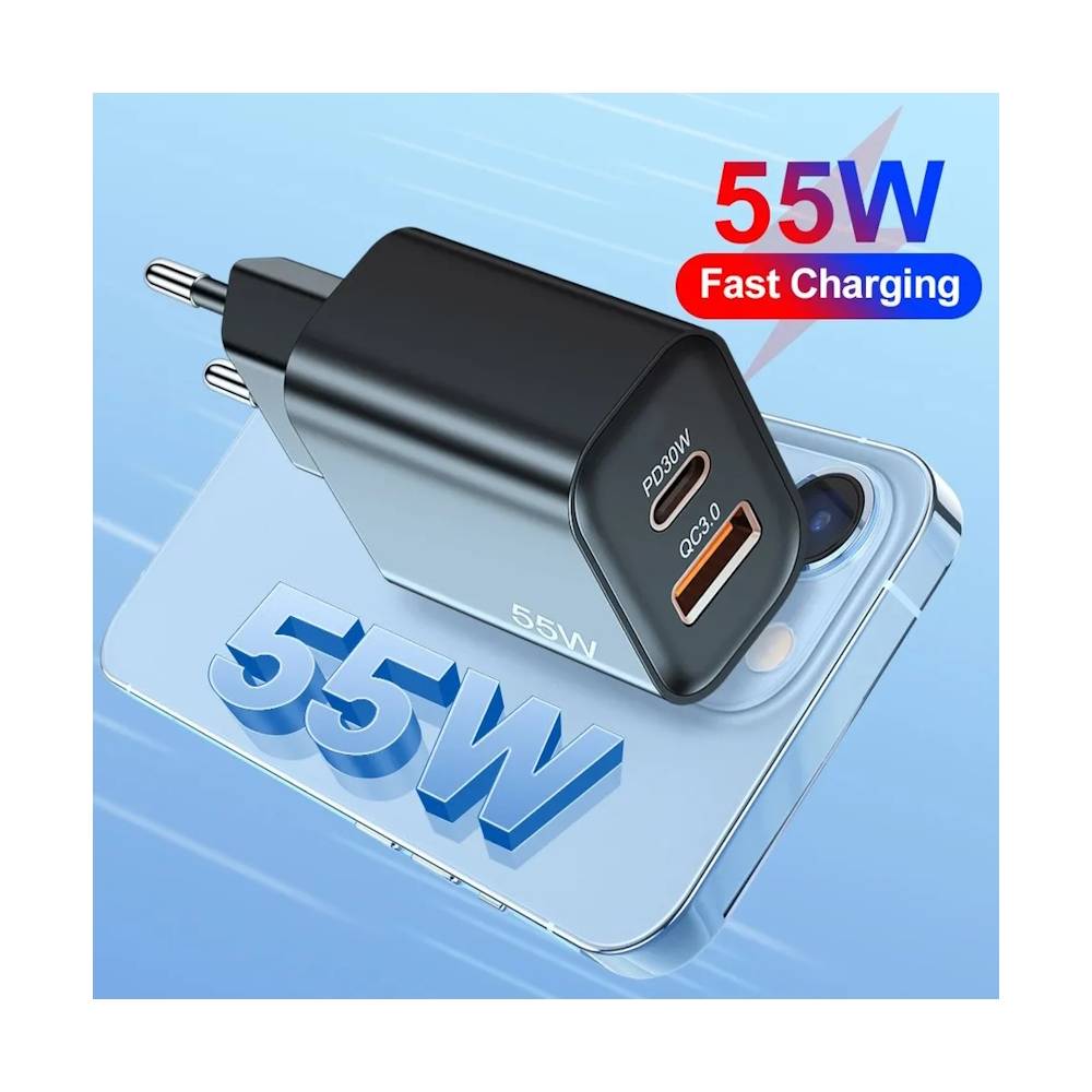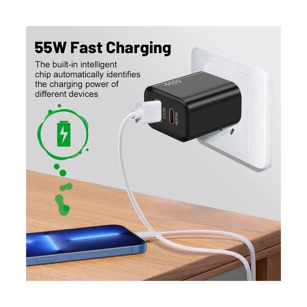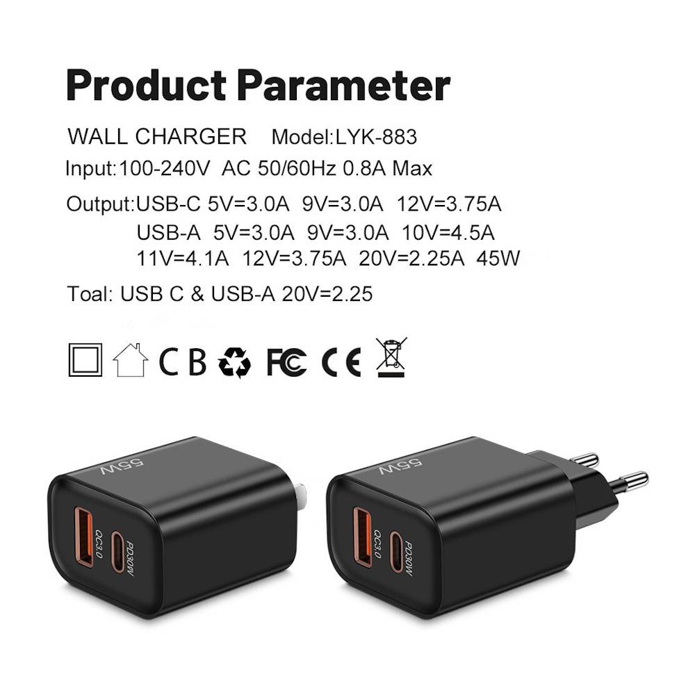 Wall Charger LYK-883. Это зарядное устройство USB Type-C с высокой мощностью 55 Вт, созданное для эффективной подзарядки широкого спектра мобильных устройств. Совместимость с различными моделями смартфонов, включая iPhone, Samsung, Xiaomi, Huawei, и многими другими.